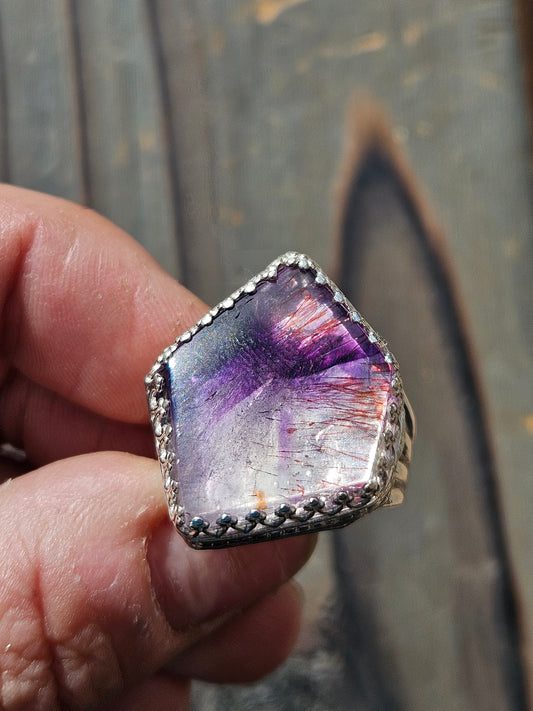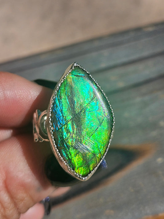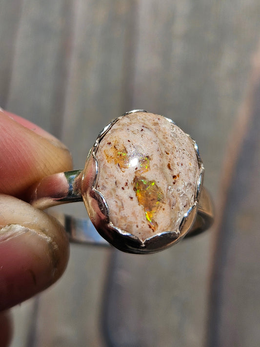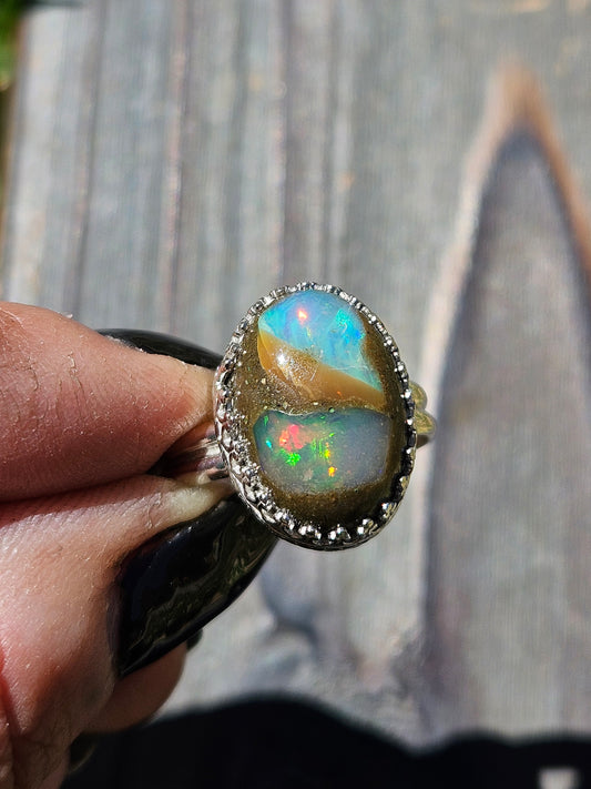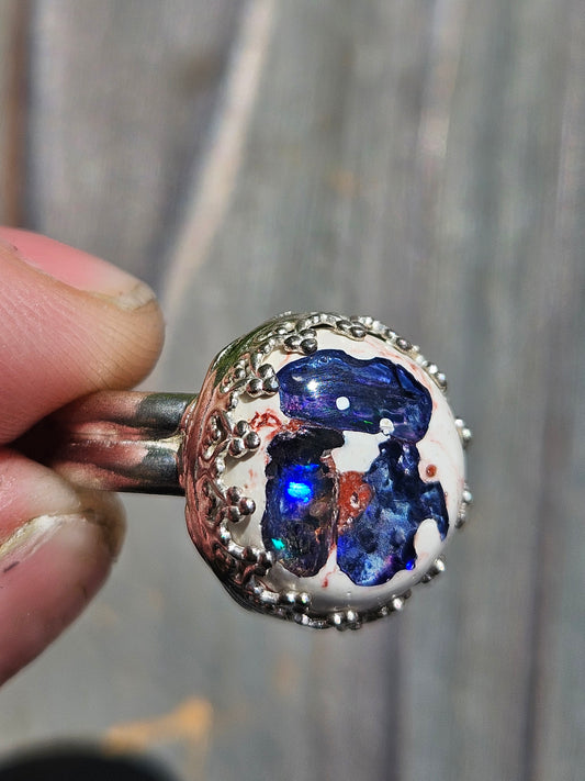 Ammolite and Black Australian Opal Ring, size 8 The ring in person was even better than the photos. It is stunning and unique. I love it!