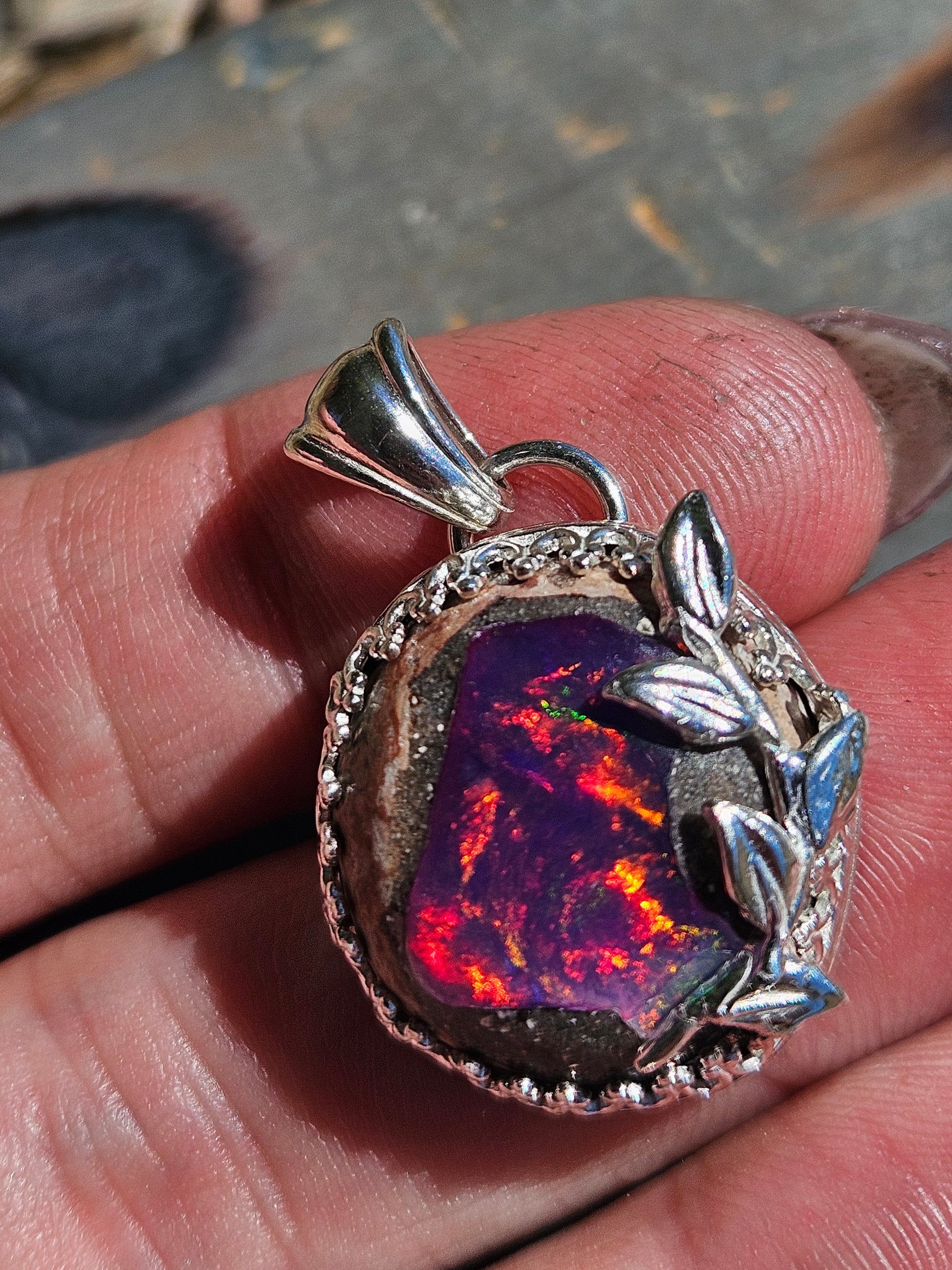 Pink galaxy opal pendant featuring a silver vine of beauty
