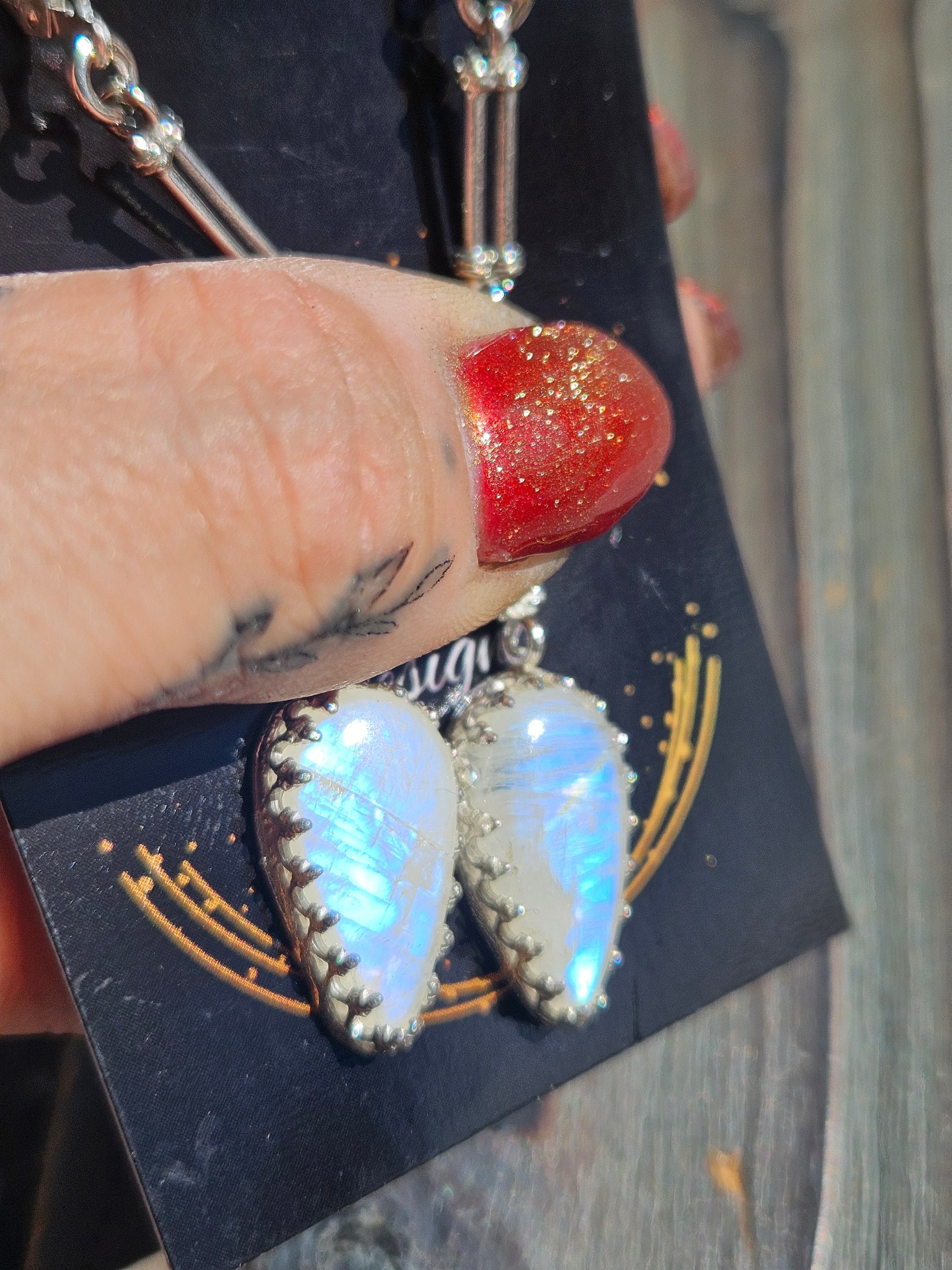 About 3in long, with the leverback included, making these rainbow Moonstone earrings a statement for sure! Solid sterling silver with amazing chain extentions!